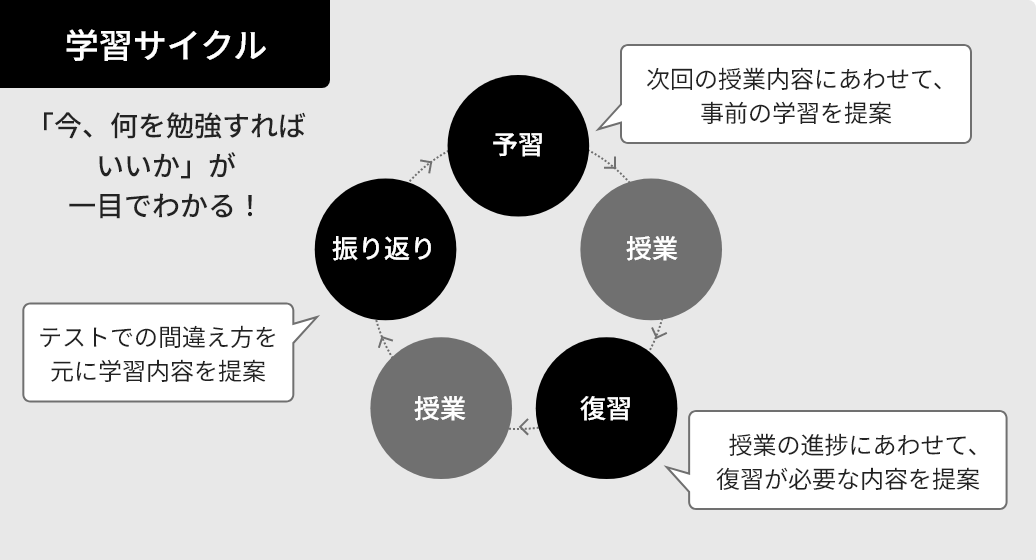 テストでの間違え方や学習の進度をもとに、一人ひとりに合わせて反復学習のための問題やテキストを提示。「今、何を勉強すればいいか」が明確になるため、効率的な予習・復習をサポートします。