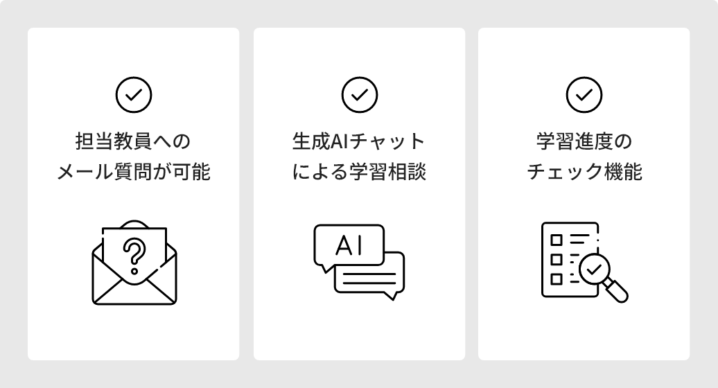 学習ブランクがあっても安心の学習体制。教員への質問サポートやAIチャット相談、進度チェック機能で、一人ひとりの学びをしっかり支えます。