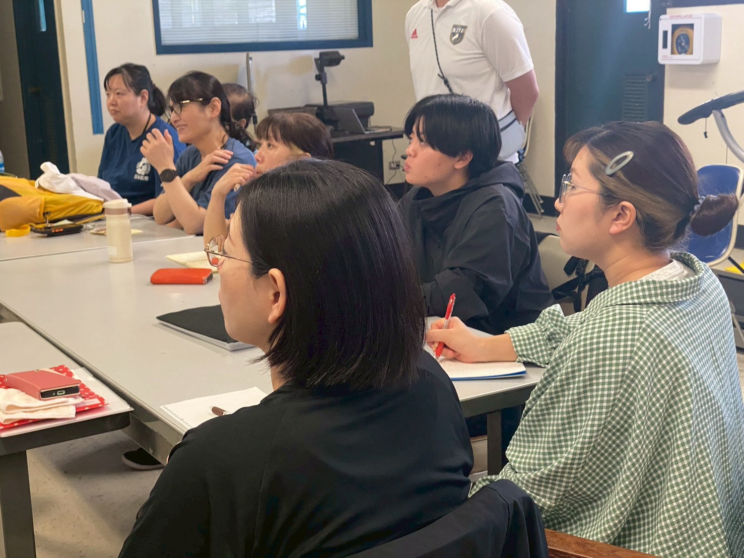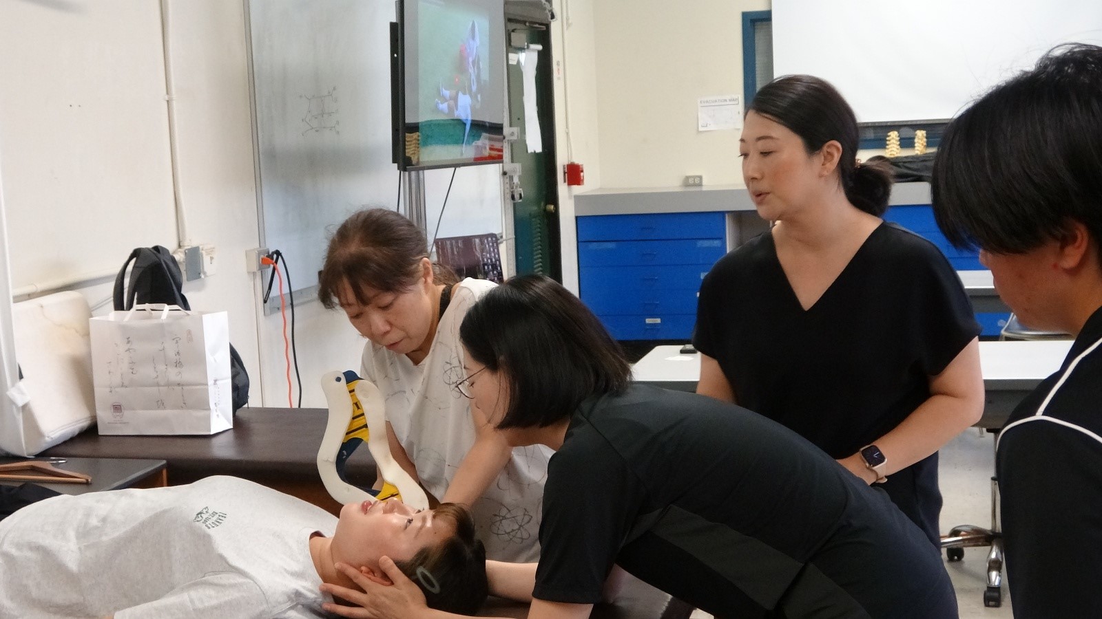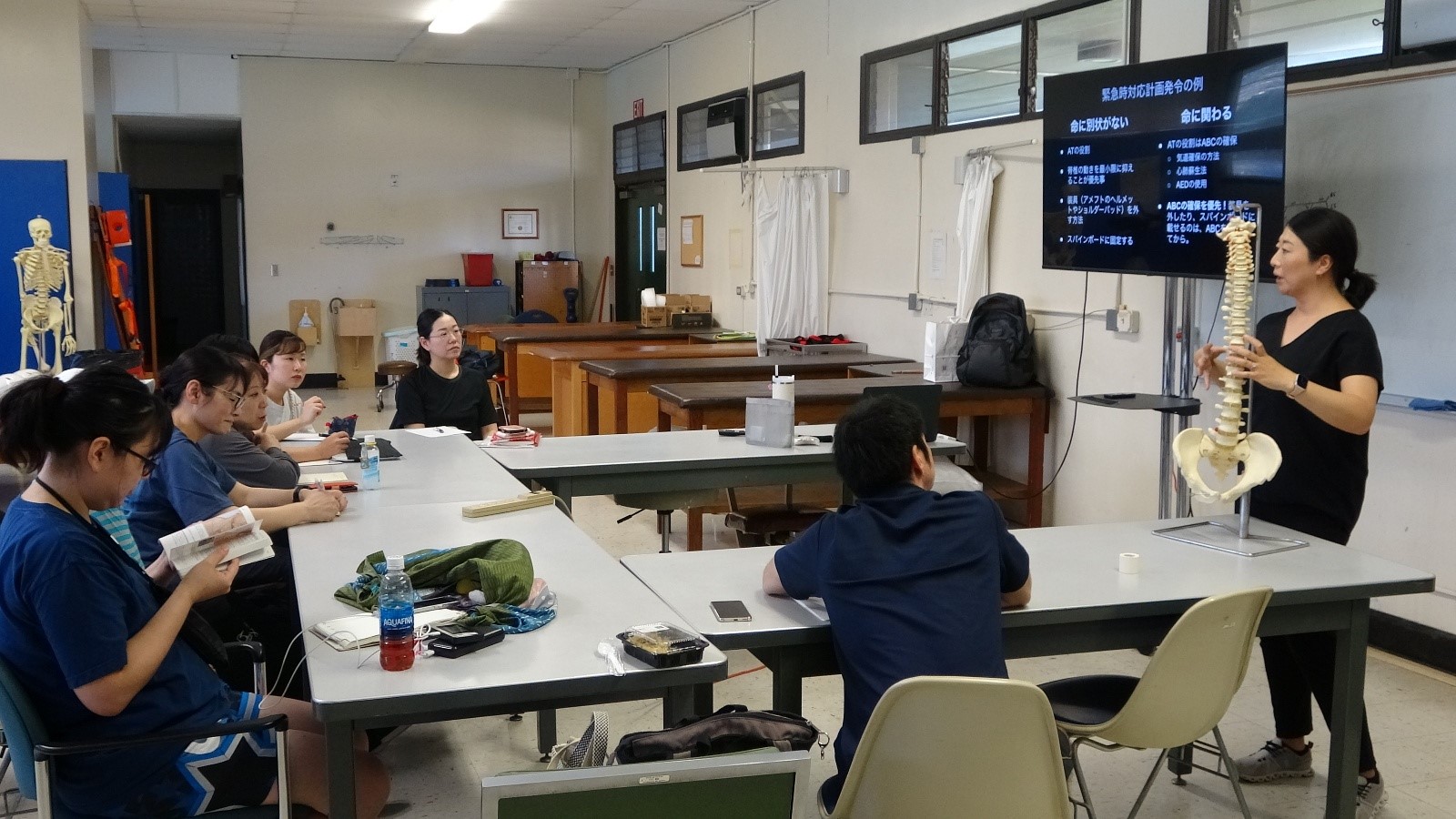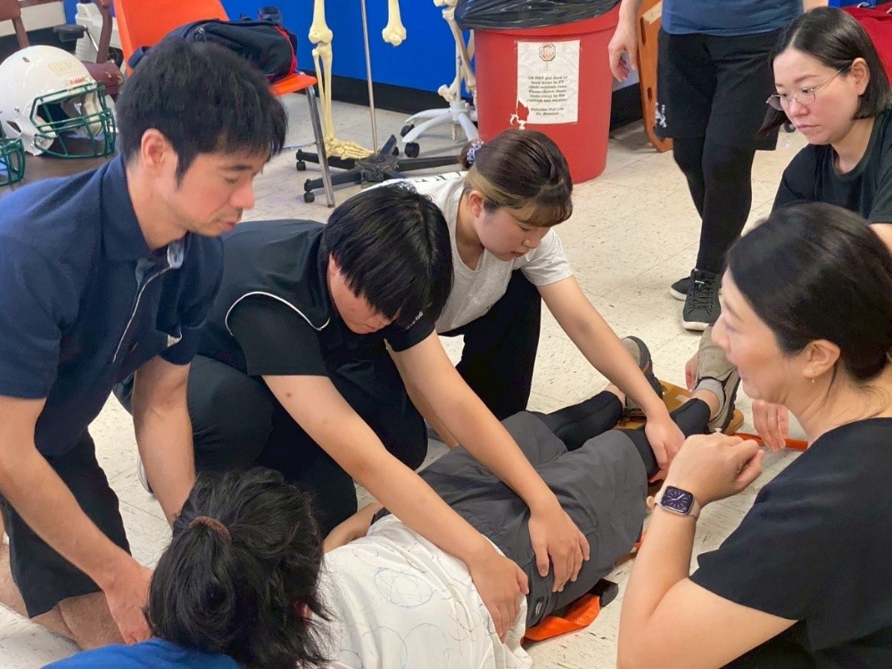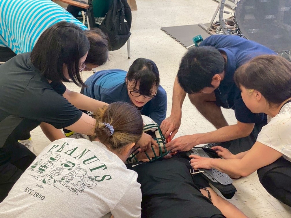 ハワイ大学の白幡先生にご担当いただきました。先生はアスレティックトレーナーとしての現場経験が豊富で、その講義は実践的で大変素晴らしい内容でした。脊椎損傷が疑われる選手のフィールドでの搬送前処置は、選手生命や命に関わる極めて重要なものです。講義と実技を通して、緊張感の中にも学びの多い時間となりました。