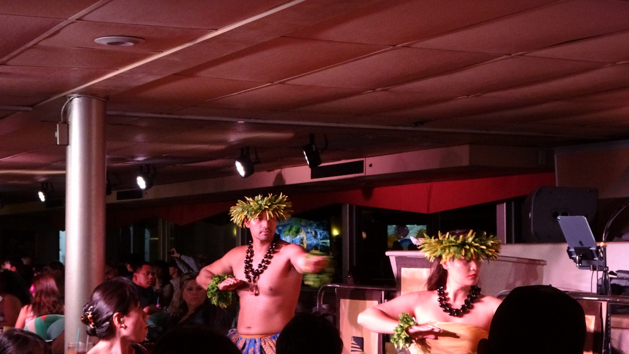 食事が落ち着き始めた頃、心地よい音楽が流れだし、ダンサーの方々がフロアに登場しました。目の前で繰り広げられる本格的なハワイアンダンスの迫力と美しさに、参加者一同、とっても感動しました。