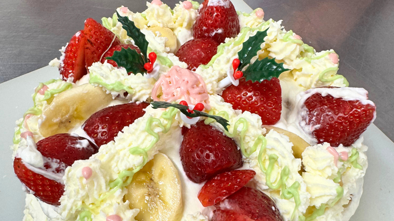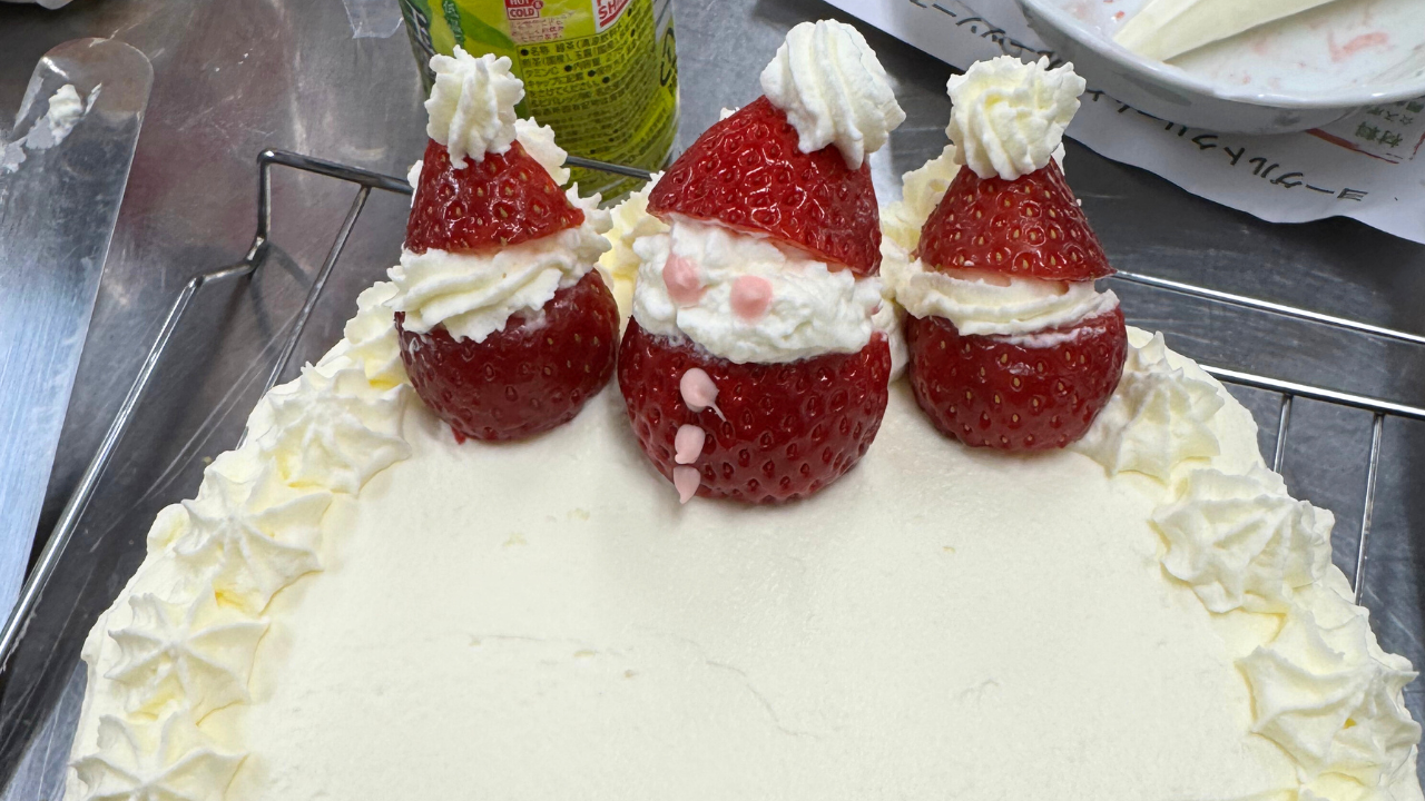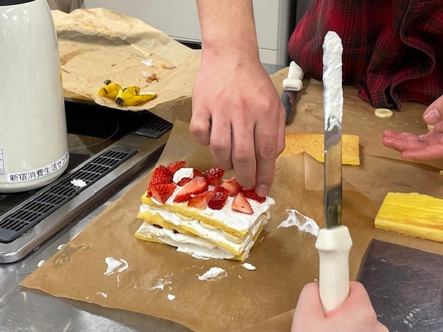 スポンジにクリームを塗ったり、フルーツを飾ったりと、