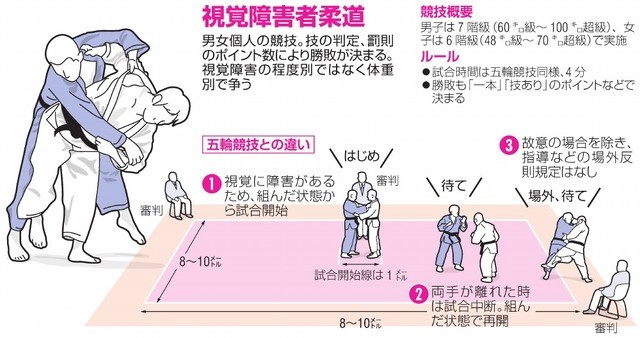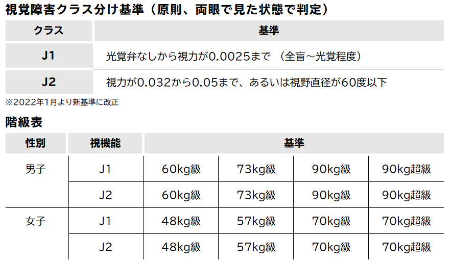 パラオリンピックや世界大会では、視覚障がいの程度によりJ1(全盲)とJ2(弱視)にクラス分けされたうえで体重別(男女各4階級)で争います。